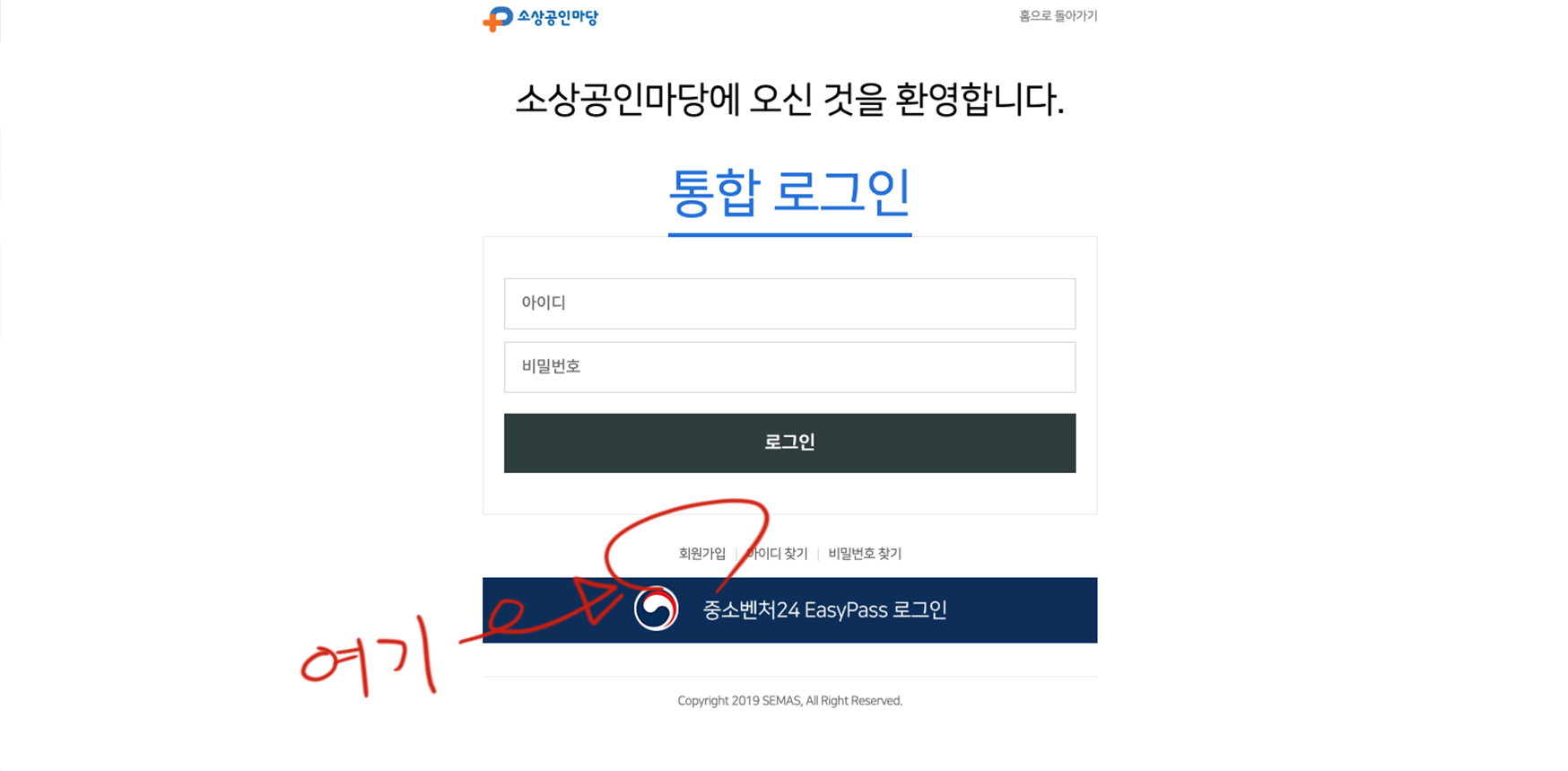 소상공인 지식배움터 첫화면 우측 상단에 [로그인]버튼을 클릭하시면 가입화면으로 들어갑니다.