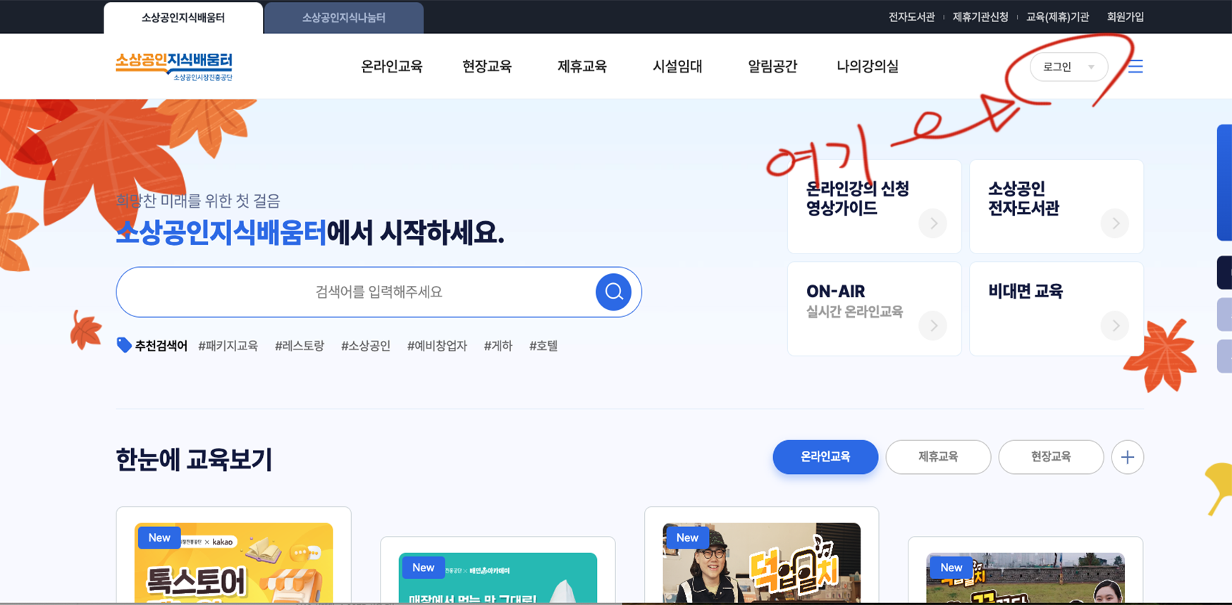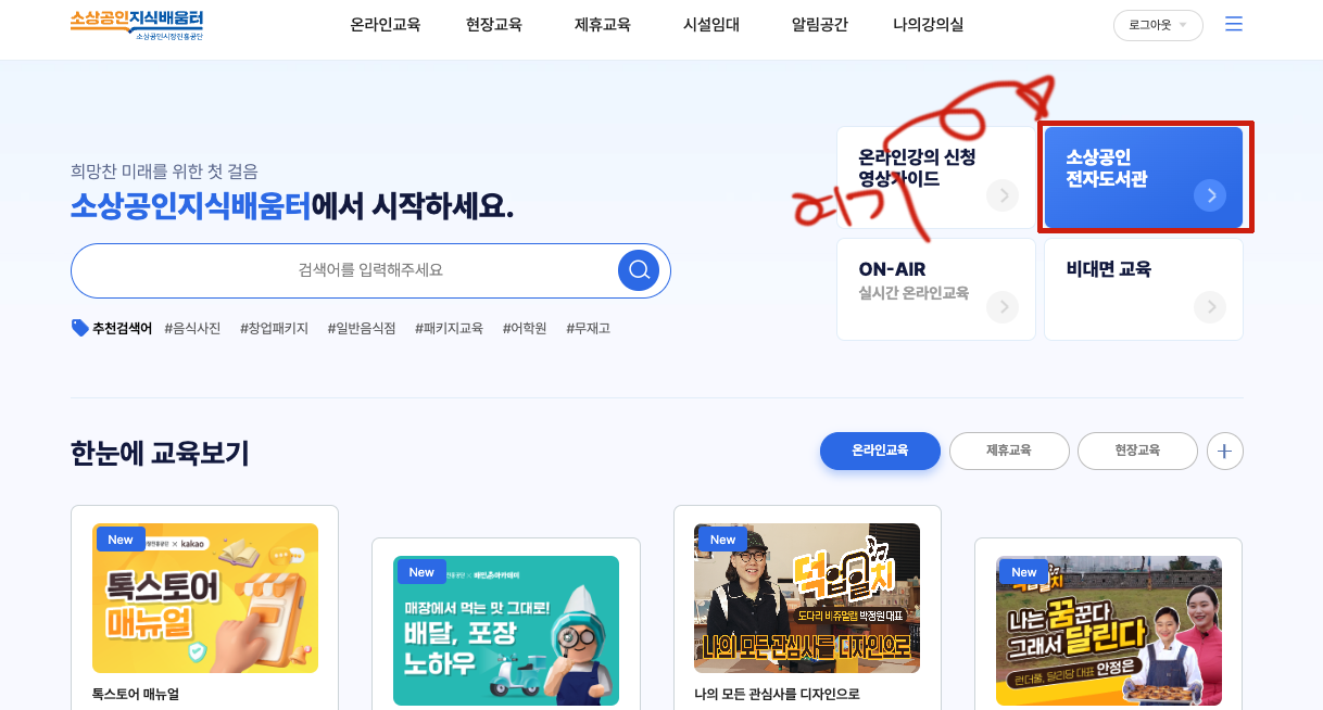 소상공인 24 페이지에는 온라인 교육이 없습니다. 당황하지 마시고 다시 소상공인 지식배움터로 들어가시면 됩니다.