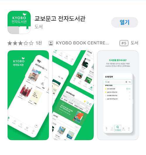 아래 있는 애플 앱스토어나 안드로이드 구글스토어 링크에서 [교보문고 전자도서관]을 검색후 해당앱을 다운 받으세요