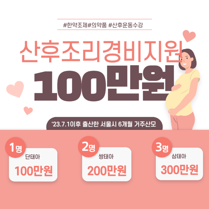 산모 1인당 산후 조리경비 100만원을 산모 본인 명의카드에 100만원 바우처로 지원해 드립니다.