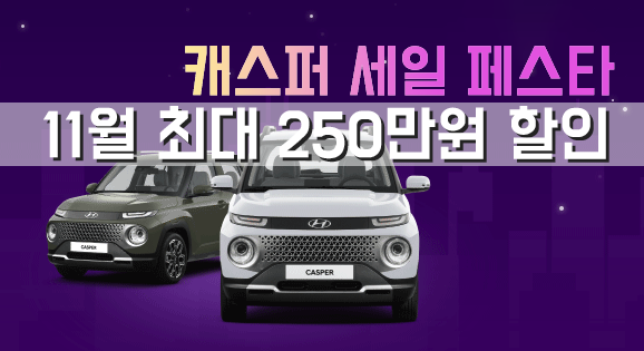 가격 때문에 캐스퍼 구매를 망설이시던 분들에게 11월 한 달 [250만 원 가격 할인]과 [아이폰 15 PRO] 증정, [네이버 페이 30000원 쿠폰] 증정 이벤트가 있으니 꼭 혜택을 받으시기를 바랍니다.