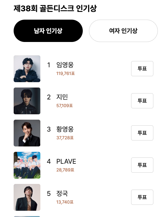 2023년 골든 디스크 어워즈 인기상 투표에서 BTS방탄소년단 지민이 임영웅의 기세에 눌려 2위에 머물러 있습니다.